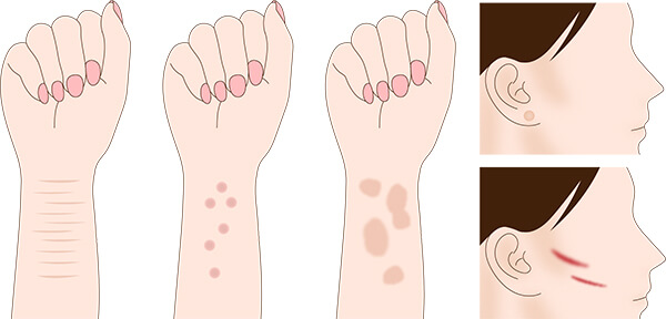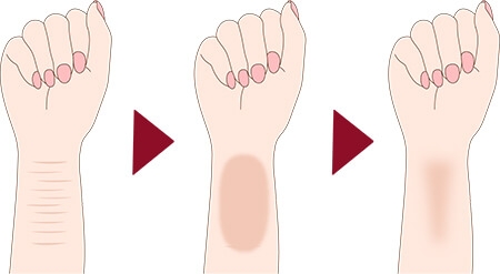 傷跡はうすく白い1本の線で残りますが、それより太く・濃く残ってしまう場合もありますが、現在の症状より軽減され目立たなくなります。