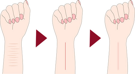 傷跡修正は、リストカットや根性焼き、事故や怪我による外傷、妊娠線や帝王切開痕、手術で残ってしまった傷跡など…気になる傷跡を目立たなくさせる治療です。